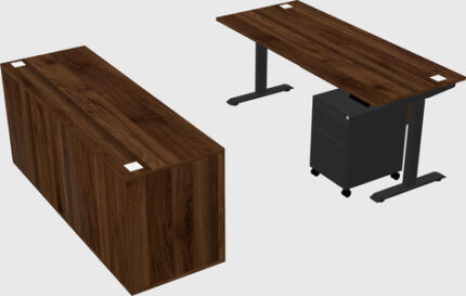 Bureau électrique à Hauteur Réglable En Noyer Columbia, Avec Crédence, Tiroirs Mobiles En Métal Et Panneau De Fond, à Moteur Parallèle Double